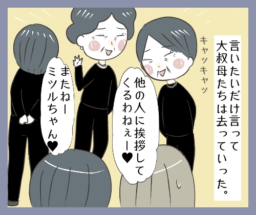 そこへやってきた姉のミツルさんに、大叔母たちは「おばあちゃんはツルナちゃんより長女のミツルちゃんの方が可愛かったのよー」と追い討ちをかけます。