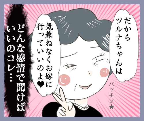 前回、大叔母たちから浴びせられる心ない言葉に対し、「この人たちにとってはそれが普通で当たり前のことだから、悪気はないんだろうけど…聞いてるのしんどいなー」と少しへこんでいたツルナちゃん。