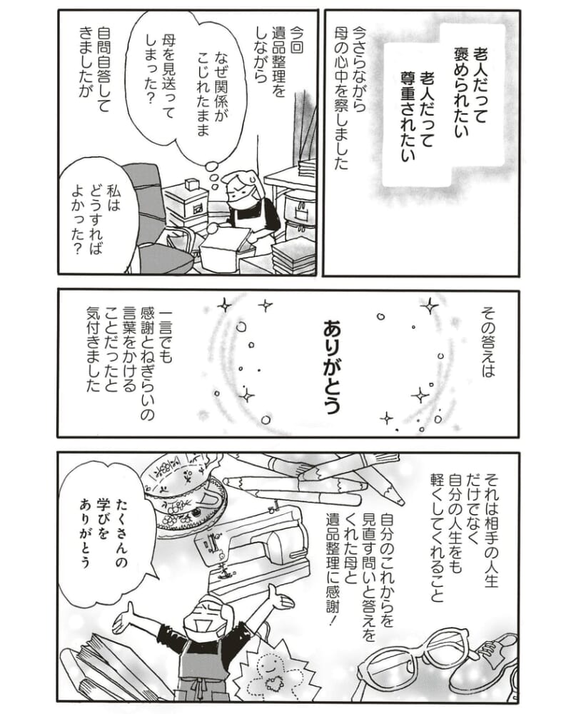 <広告> 母に「ありがとう」を言わなかった私。遺品整理の中で、ようやく分かったこと【アラ還が遺品整理で学んだ人生を軽くする方法】第13話「母に対する私の文句」② by 堀内三佳 ‹ 前の話 作家一覧 <広告> 堀内三佳 ‹123› 2026/01/20 【アラ還が遺品整理で学んだ人生を軽くする方法】絶賛連載中! <広告> 作者:堀内三佳先生 ‹123› ★フォローして堀内三佳さんの最新記事をチェック! ‹ 前の話 作家一覧 本記事は個人的体験談などに基づいて作成されており、脚色なども加えられている場合もあり、必ずしも各読者の状況にあてはまるとは限りません。この記事の情報を用いて行動される場合、ご自身の責任と判断により対応いただけますようお願い致します。尚、記事に不適切な内容が含まれている場合はこちらからご連絡ください。 -------------------------------- <広告> 作者:堀内三佳 > 作者ページへ 堀内三佳さんの他のシリーズを読む 人生の目次を作ったら、時間のムダがなくなりました - じいじばあば, ママ アラ還が遺品整理で学んだ人生を軽くする方法, 堀内三佳 <広告> 関連記事 関連記事: 「学級崩壊は息子さんのせい」ママ友の指摘に戸惑う母。ある申し出を切り出した【息子が加害者になりました 第21話】 by ゆる子 関連記事: 不穏な噂のあるいじめっ子。友人から一人にならないよう忠告されるが…【いじめっ子JCの『こんなはずじゃなかった!』第13話】by 佐伯梅 関連記事: 保育園送迎は無理と言う妻。「家事はやる」のひと言を信じた結果…【未熟な夫婦の不協和音 #29】 by ぴん 関連記事: 「話してもいいかな?」夫と同じ活動をする元同僚。不信感を抱く妻に切り出した一言は【宗教2世と結婚しました #88】 by ぷっぷ 関連記事: 不安しかない…!全員参加の保育園「父母会」って一体なに?!【保育園に入園できたのは良かったけど…そこには父母会が存在した!①】 by はなうさ 関連記事: 夫の行動にイライラが募った結果、娘にまで…~喧嘩編~【たった一言が言えなくて②】 by 赤井トマト 関連記事: 夜11時の焼き肉「ぐっちゃんのいえ」第5話-ママ、一人焼肉する② by chiiko 関連記事: 妊娠8ヶ月で突然の事故!お腹の赤ちゃんは…【愛犬との不思議な話③】 by リコロコ 関連記事: おじいのハゲ頭を娘に見せると… by ミドリャフカ