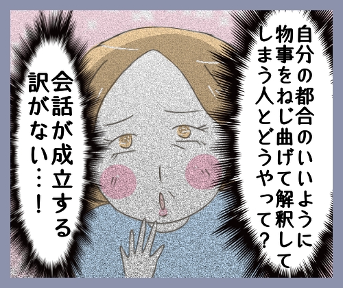 ミツルさんは、自分勝手に事実をねじ曲げて解釈してしまう母親とは、永遠に一方通行で会話が成立しないことに気づいてしまいました。