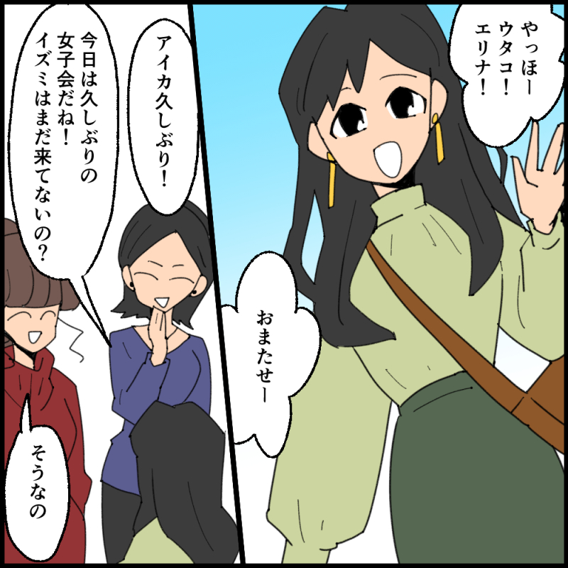 アイカ、イズミ、ウタコ、エリナの4人は学生時代からの仲良し。全員結婚した後も定期的に女子会を開いています。