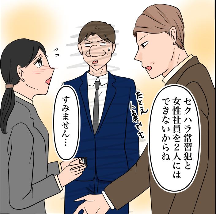 社内の女性に無理やり近づき人事に訴えられた男は、現れた担当者を落とせば助かると考える。