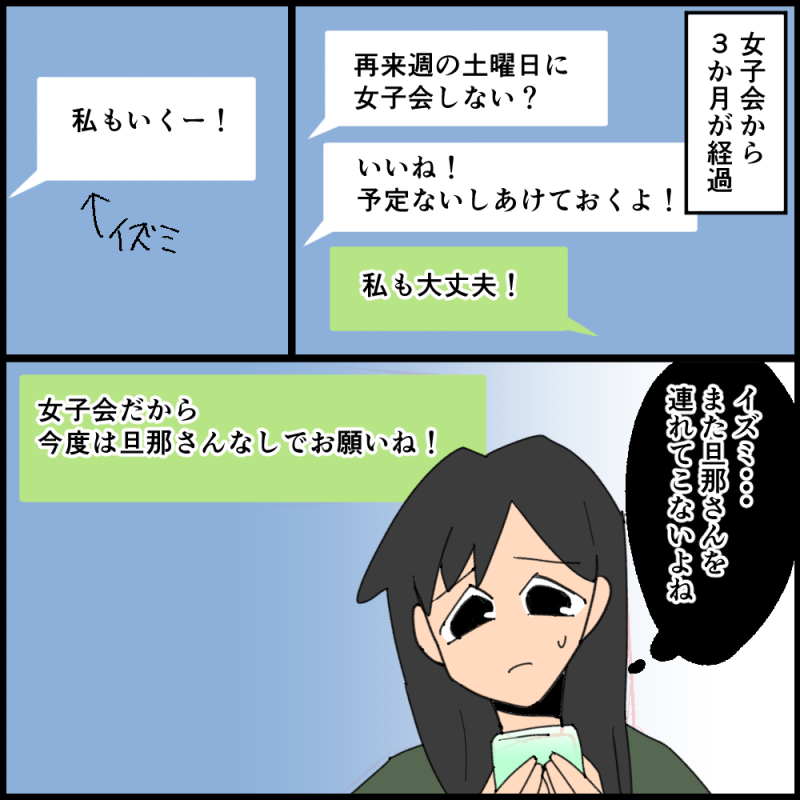 しかし友人の一人イズミは度々連絡なしに自分の夫を女子会に連れてきます…。