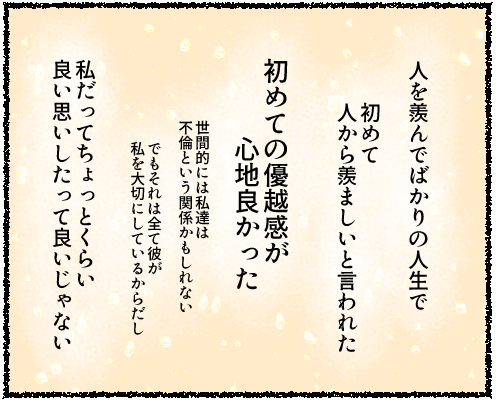 幼い頃から続く劣等感を抱えたまま社会に出た彼女。久しぶりに集まった友人たちの中でもその気持ちは変わらなかった。そんな中で何気なく“取引先の彼”の存在を口にすると、思いがけず向けられた「羨ましい」という声。 “彼の秘密”は言わないまま、彼女が初めて感じる気持ちを味わっていた…