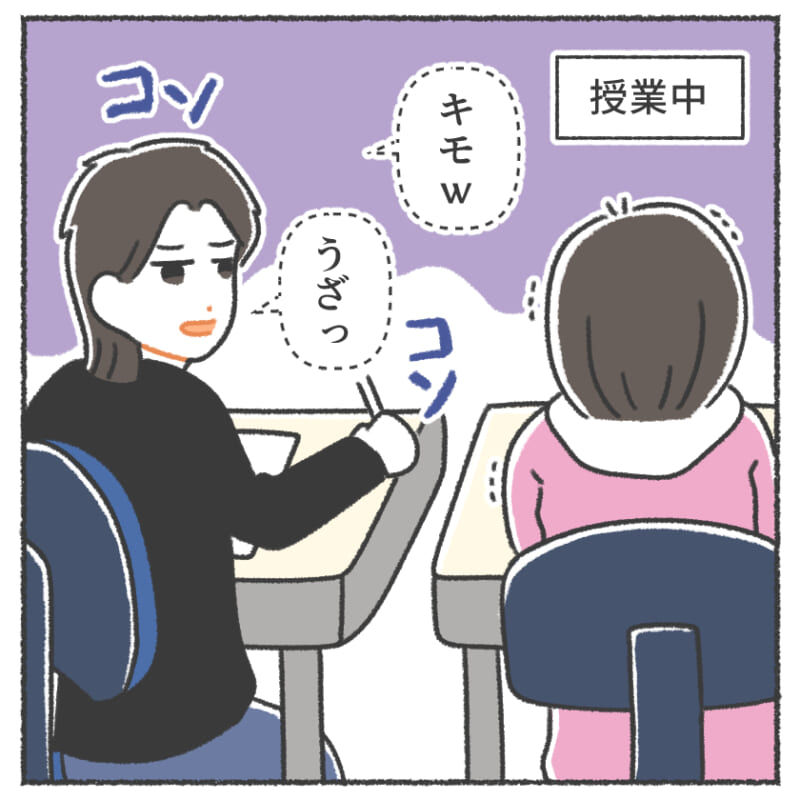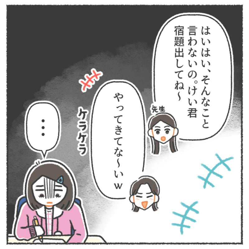 学校でも塾でも同じ男の子から心ない言葉を受け続け、唯一の拠り所だった塾さえ落ち着かない場所になっていった主人公。授業後に塾長が声をかけてくれても、ごまかすことしかできず、苦しさだけが積み重なっていきました。そんなある日、教室に入った主人公の胸に、静かにざわめきが広がる出来事が ――。