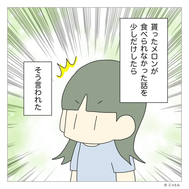 言えない自分が悪いのだと分かっている。でも言えないまま、想いだけが胸に溜まっていく。出産祝いとしていただいた人生で二度目となるメロンは、嬉しい贈り物のはずだったのに。祝われているのは誰なのか ――そんな小さな違和感を抱えながらも、私はやっぱり何も言えなくて…。