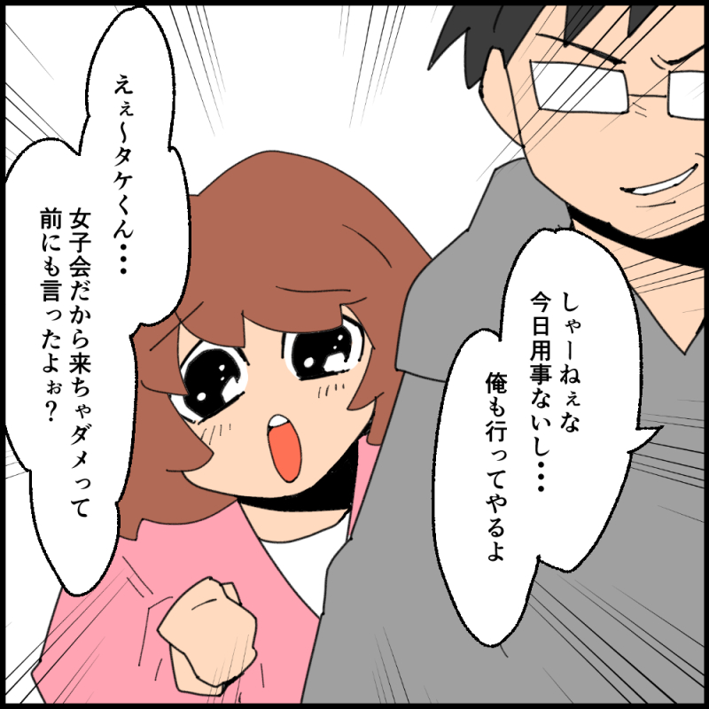 女子会なのにいつも“夫同伴”で現れるイズミ。空気を読まないタケオは、集まりの趣旨を無視した発言を重ね、昇進したアイカの仕事まで軽く扱うような言い方をしてしまう。