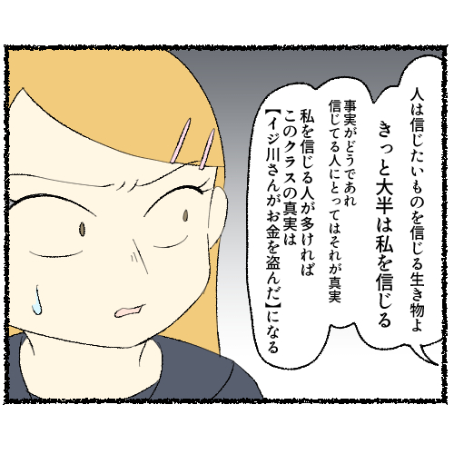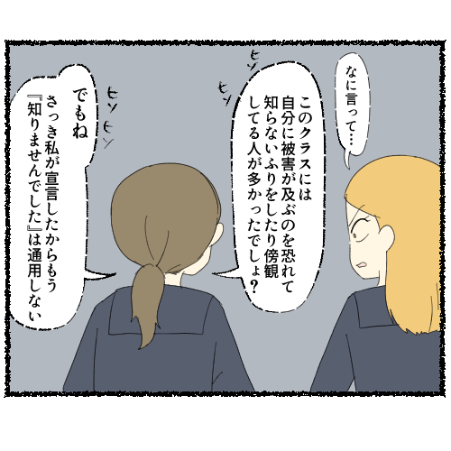 被害を受けた側ほど黙ることを求められる空気に、強子は違和感を覚えた。恥じるべきなのは誰なのか。クラス全員の前で先生に相談したうえで、あえてイジ川に近づく強子。強子がそっと口にした言葉は ──。