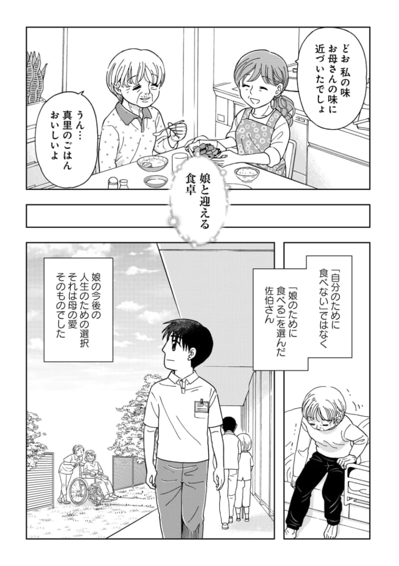 <広告> 全ては娘のため ――寝たきりだった母が選んだ“親の最期の役割”【お食い締め 口から食べられないアナタへ ~言語聴覚士が見たそれぞれの選択~】第2話後編 by 牧野日和&かなしろにゃんこ。 ‹ 前の話 作家一覧 <広告> かなしろにゃんこ。 ‹1234› 2026/02/03 ★「お食い締め 口から食べられないアナタへ ~言語聴覚士が見たそれぞれの選択~」を単行本で読もう! <広告> 著者:牧野日和、かなしろにゃんこ。 ‹1234› ★フォローしてかなしろにゃんこ。さんの最新記事をチェック! ‹ 前の話 作家一覧 本記事は個人的体験談などに基づいて作成されており、脚色なども加えられている場合もあり、必ずしも各読者の状況にあてはまるとは限りません。この記事の情報を用いて行動される場合、ご自身の責任と判断により対応いただけますようお願い致します。尚、記事に不適切な内容が含まれている場合はこちらからご連絡ください。 -------------------------------- <広告> 作者:かなしろにゃんこ。 > 作者ページへ > Instagramを見る - じいじばあば, 介護 お食い締め 口から食べられないアナタへ, かなしろにゃんこ。 <広告> 関連記事 関連記事: 絶体絶命!?いじめっ子のせいで見知らぬ男子高校生が校門に…【いじめっ子JCの『こんなはずじゃなかった!』第15話】by 佐伯梅 関連記事: 『病院行った方が…』妊娠を隠したい16歳の彼女に、彼氏の言葉が刺さる【16歳、命と向き合うとき #15】by ふくふく 関連記事: お前がいなくてもやってける…?!何もしない夫と娘を残し家を出た妻。夫の反応は…【“育児の敵”はそばに居る #27】 by しろみ 関連記事: 「あの嫁とはもう離婚!」息子の再婚を目論む義母が“嫁の職場”に押しかけた【夫婦ふたりじゃダメですか? #25】 by 尾持トモ 関連記事: 里帰り出産って必要?実家に戻ったら過酷な生活が待っていた!【里帰り出産を考える①】 by 林山キネマ 関連記事: アナログ人間じぃじの逆ギレ!沐浴の写真編【孫を溺愛するじぃじとの攻防④】 by 白目向き子 関連記事: 義両親との同居成立のカギを握る人物【我が家の同居話⑨】 by 山田あしゅら 関連記事: 義父は一緒に暮らすには合わせづらい人間~我が家のオトコども~【我が家の同居話⑧】 by 山田あしゅら 関連記事: 義父が嫌い!早く帰ってくれと思っていた義両親がいなくなると…【産後と義両親④】 by すやすや子