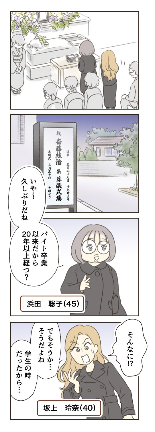 かつて同じバイト先で働いていた仲間たちが、久しぶりに顔を合わせることになる。再会の場では、当時の話やそれぞれの近況が自然と話題に上がり、仕事や家族の話へと広がっていく。20年以上ぶりに知る互いの今の状況に会話は尽きないが ――。