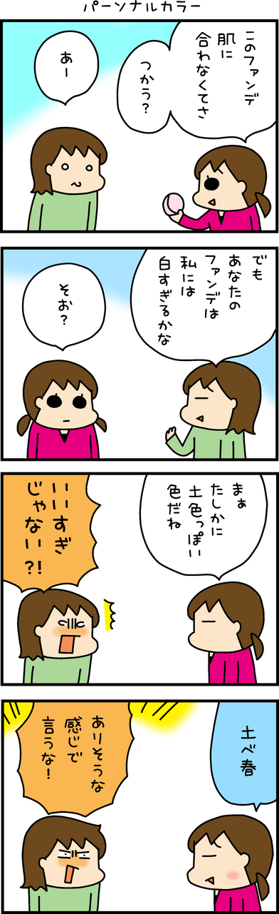 <広告> 「そのファンデ、私には白すぎるかな」そう言ったら…娘が返した一言が失礼すぎた【うちはおっぺけ~3姉妹といっしょ170話-5】by 松本ぷりっつ ‹ 前の話 一覧 <広告> 松本ぷりっつ 2026/01/26 松本ぷりっつ先生の「うちはおっぺけ~3姉妹といっしょ」絶賛連載中です♪ <広告> ★「うちはおっぺけ~3姉妹といっしょ」最新刊絶賛発売中! ★youtubeも見てね! ⇒「うちはおっぺけ~3姉妹といっしょ」をもっと読む 【うちはおっぺけ~3姉妹といっしょ】 ▶ 他の話も読む ★フォローして松本ぷりっつさんの最新記事をチェック! ‹ 前の話 一覧 本記事は個人的体験談などに基づいて作成されており、脚色なども加えられている場合もあり、必ずしも各読者の状況にあてはまるとは限りません。この記事の情報を用いて行動される場合、ご自身の責任と判断により対応いただけますようお願い致します。尚、記事に不適切な内容が含まれている場合はこちらからご連絡ください。 -------------------------------- <広告> 作者:松本ぷりっつ > 作者ページへ > Instagramを見る 松本ぷりっつさんの他のシリーズを読む 松本ぷりっつのダンナ50歳、楽しく健康イケオジ部! 子育てバッチコイ! - 姉妹, 子育て うちはおっぺけ~3姉妹といっしょ, ほのぼの, 笑い <広告> 関連記事 関連記事: いじめられた同級生、涙の訴え→「うちの子、元気すぎるからね!」母親の身勝手すぎる解釈にあ然【うちの子は優しい天使ちゃん #20】 by はいどろ漫画 関連記事: 「…線は?」妊娠を疑う高1。検査薬を見た瞬間、頭が真っ白に【16歳、命と向き合うとき #12】by ふくふく 関連記事: 今さらそれ言う?!「僕、母乳出ないしw」笑う夫のズレた考えに、出産間近の妻は…【ズレてる夫とホルモン保健師 #6】 by nekoneko 関連記事: 「私はひどい奥さんだった」夫の行動を理解できない私に、元同僚が過去体験を語る...【宗教2世と結婚しました #89】 by ぷっぷ 関連記事: 元夫が盗ったと怪しむ先輩から依頼された『結婚指輪探し』…果たして夫はクロなのか?【変わっていく元夫㉒】 by 木村アキラ 関連記事: 優しいと思っていた母の再婚相手が結婚後に豹変。笑顔で私に言うことは…【新興宗教にハマった母と、それに支配された私18】by すじえ 関連記事: 総額20万円のお金が失くなった⁉︎盗んだのは小学2年生の『あの子』?【うちの子は絶対に盗んでません!第92話】by こっとん 関連記事: 欠席したのに1人で登校しようとして途中で保護された息子。慌てて謝りに行くと…【お騒がせ長男④~最終話~】by あゆたろう 関連記事: 栄養相談で言われた思いがけないこと。義父の心無い言葉で離乳食への不安が溢れた私に栄養士さんは…【娘に勝手に食べ物を与える義父④】 by あんころ