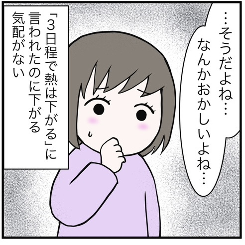 <広告> 「何か、おかしい!」10か月娘の発熱…親の直感で受診した結果【子どもの熱、様子見でいいの? #2】 by 早乃あかり ‹ 前の話 一覧 <広告> 早乃あかり ‹12› 2026/02/20 発熱して3日目 初めての子ども、初めての発熱 医者からは「それは突発性発疹だよ」と言われたが一向に下がる様子がない… このまま様子見でいいの? <広告> ‹12› 【子どもの熱、様子見でいいの?】 ▶ 他の話も読む ★フォローして早乃あかりさんの最新記事をチェック! ‹ 前の話 一覧 本記事は個人的体験談などに基づいて作成されており、脚色なども加えられている場合もあり、必ずしも各読者の状況にあてはまるとは限りません。この記事の情報を用いて行動される場合、ご自身の責任と判断により対応いただけますようお願い致します。尚、記事に不適切な内容が含まれている場合はこちらからご連絡ください。 -------------------------------- <広告> 作者:早乃あかり > 作者ページへ > Instagramを見る - 0歳児, しくじり育児, 子育て, 未分類 子どもの熱、様子見でいいの?, 早乃あかり <広告> 関連記事 関連記事: 浴室から妻の悲鳴…「偶然」か、それとも ――嫉妬した夫がした『報復』とは【妻が突然家を出て行きました #42】 by ずん 関連記事: 「俺も同じです」馬鹿にされ落ち込む妻の前で、夫が笑顔で放ったひと言【女子会に夫を連れてくる友人 #11】 by 音坂ミミコ 関連記事: 「これ、書いてくれるわね」義母が嫁に迫った“最後の選択”【夫婦ふたりじゃダメですか? #28】 by 尾持トモ 関連記事: 「できる仕事は自分でやって」妊娠中に私を追い詰めた存在は…【人間関係で無理した妊娠 #1】 by なつめももこ 関連記事: 元夫のせいで私のイメージは「最悪な嫁」だったけど…ヤバイと思っていた先輩の言葉で思わぬ展開に!【変わっていく元夫⑱】 by 木村アキラ 関連記事: 頭の中が『?』でいっぱい!盗みについて伝えた『あの子』の母親の思いがけない言葉とは?【うちの子は絶対に盗んでません!第84話】by こっとん 関連記事: 《SNSトラブル》名前も住所も事故のことも全てネットに晒される!追い詰められた娘はついに…【中学生の娘がSNSで脅された!?13】 by さやけん 関連記事: 強烈に子供同士を比較したがるママ友が3歳息子を大声で叱った「小さい子に負けてるよ!」 その時、保健師さんが…【勝ち負けにこだわるママに出会った話③】 by ぬぴ 関連記事: 一時保護所に入ったことでさらに悪化した親子関係。ヤングケアラーだった私の歩む道は…【姉育てに疲れて一時保護所に入った話⑬~終~】 by ゆーとぴあ