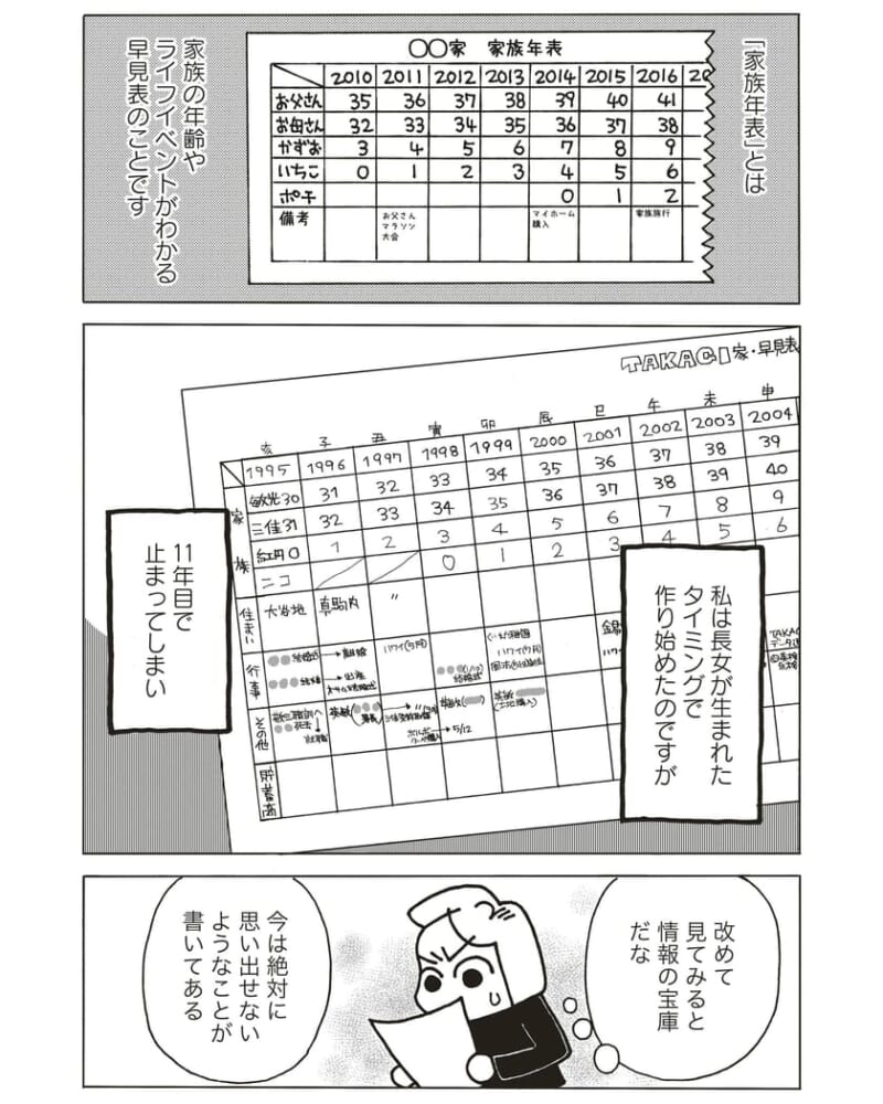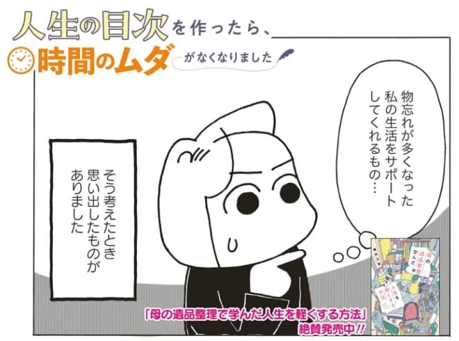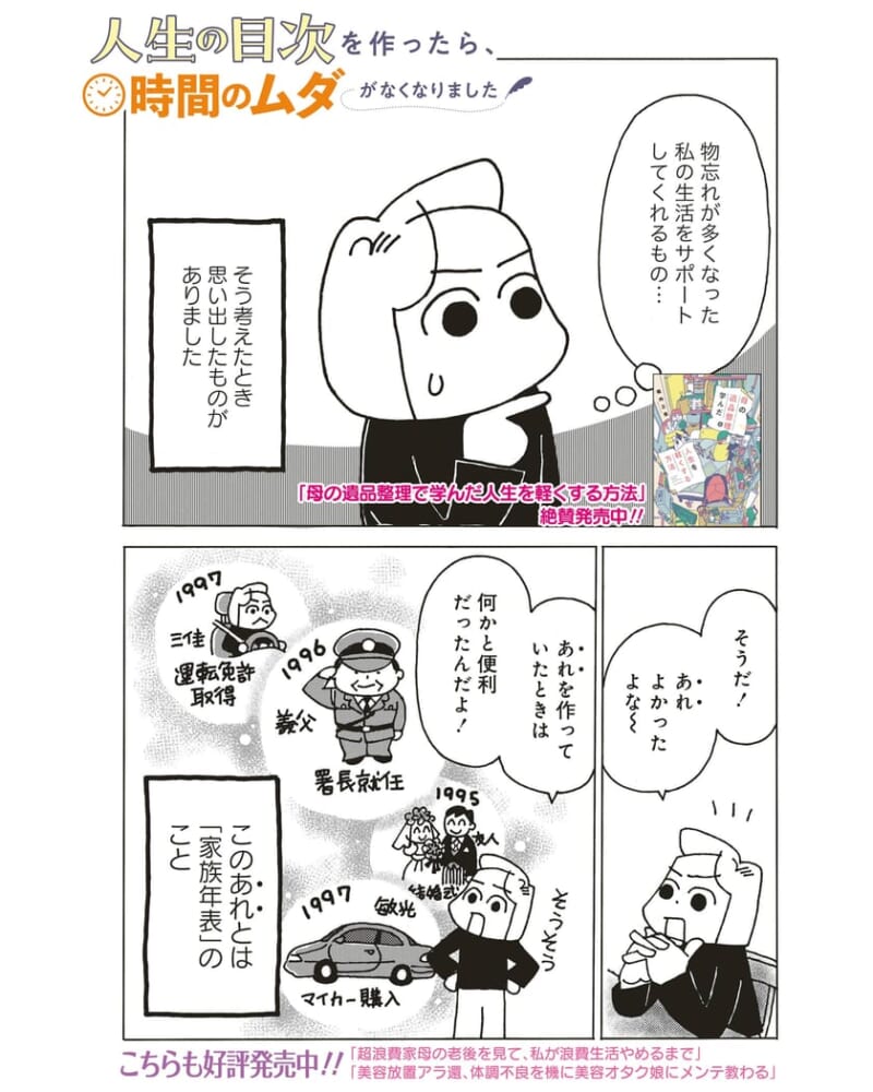<広告> 「なんでやめたんだっけ?」11年目書いて放置の家族年表を開いたら…【人生の目次を作ったら、時間のムダがなくなりました】第2話「物忘れが多くなった私をサポートするものは?」 by 堀内三佳 ‹ 前の話 一覧 <広告> 堀内三佳 ‹12› 2026/02/28 【アラ還が遺品整理で学んだ人生を軽くする方法】絶賛連載中! <広告> ‹12› 【人生の目次を作ったら、時間のムダがなくなりました】 ▶ 他の話も読む ★フォローして堀内三佳さんの最新記事をチェック! ‹ 前の話 一覧 本記事は個人的体験談などに基づいて作成されており、脚色なども加えられている場合もあり、必ずしも各読者の状況にあてはまるとは限りません。この記事の情報を用いて行動される場合、ご自身の責任と判断により対応いただけますようお願い致します。尚、記事に不適切な内容が含まれている場合はこちらからご連絡ください。 -------------------------------- <広告> 作者:堀内三佳 > 作者ページへ 堀内三佳さんの他のシリーズを読む アラ還が遺品整理で学んだ人生を軽くする方法 - ママ 人生の目次を作ったら、時間のムダがなくなりました, 堀内三佳 <広告> 関連記事 関連記事: 「それでも母親か?」育児しても“いいとこどり”だけ、自称イクメン夫に妻が反撃【“育児の敵”はそばに居る #34】 by しろみ 関連記事: DMを送り続けてくれた相手に打ち明けた不安。そこへ投げかけられる、核心に迫った言葉は…【16歳、命と向き合うとき #23】by ふくふく 関連記事: 「なんで怒るわけ? 俺が何をしたっていうんだよ」風呂の電源を切った夫の感覚が怖すぎる【妻が突然家を出て行きました #43】 by ずん 関連記事: 「自分の親の介護、人任せは情けないと思わない?」母に押し付ける父に娘が詰め寄る【最高の親孝行⁉︎ #26】 by 新垣ライコ 関連記事: 『靴下おばさん』の次に出会った、驚くべき人物は…【家族が見つけた息抜きの仕方②】 by aandp 関連記事: 旦那から突きつけられた、逃げ出したいほど嫌な問題【みちのみちのく⑥】 by やよいかめ 関連記事: 強烈な人見知り&場所見知り息子を連れて 電車に挑戦!?【4歳息子は元人見知り㉓】 by ユキミ 関連記事: 集団健診が苦手!モヤモヤする問診票【1歳半健診の憂鬱①~前日の憂鬱~】 by ポンコツママ 関連記事: 3歳1ヶ月、幼稚園入園。【娘の発達障害㉘~パンツでの登園に増す不安~】 by SAKURA