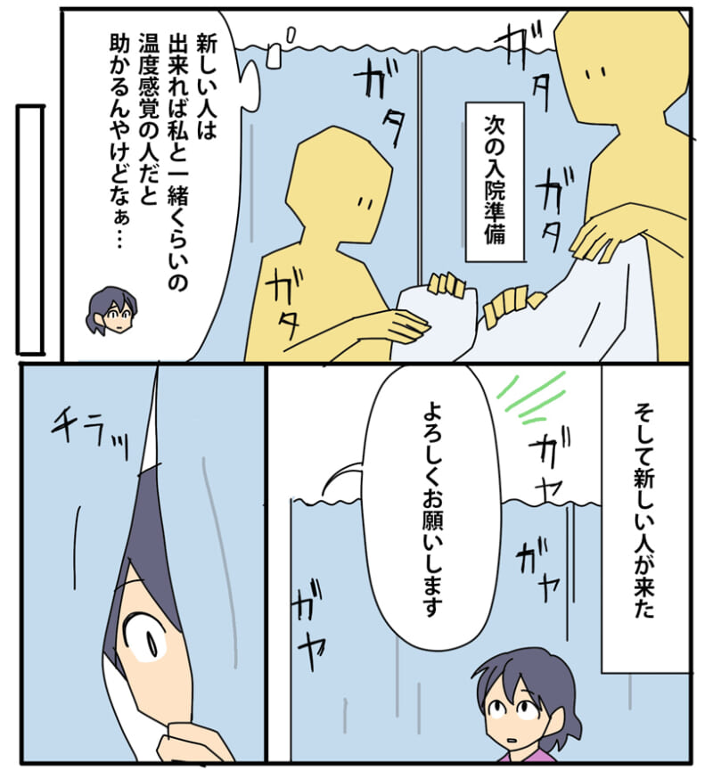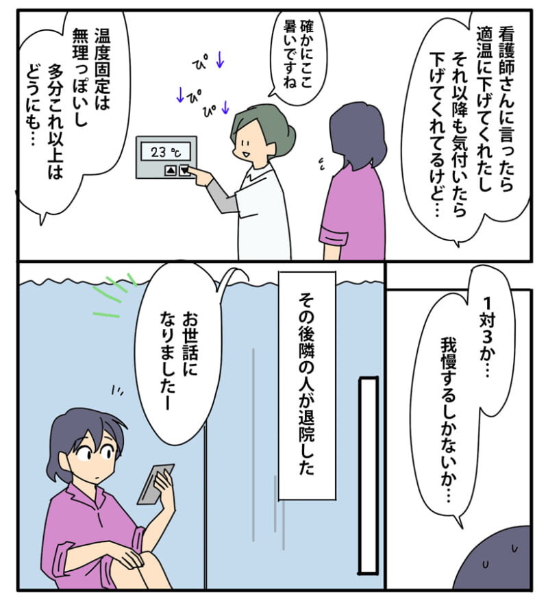 <広告> 何度下げても30度に戻る大部屋の室温…同室3人の意外な“共通点”【大部屋入院1vs3! #2】 by カモちも ‹ 前の話 一覧 カモちも ‹12› 2026/04/02 <広告> ‹12› 【大部屋入院1vs3!】 ▶ 他の話も読む ★フォローしてカモちもさんの最新記事をチェック! ‹ 前の話 一覧 作者: カモちも > 作者ページ > SNS カモちもさんの他のシリーズを読む 大部屋入院1vs3! トラブル カモちも, 大部屋入院1vs3! <広告> 本記事は個人的体験談などに基づいて作成されており、脚色なども加えられている場合もあり、必ずしも各読者の状況にあてはまるとは限りません。この記事の情報を用いて行動される場合、ご自身の責任と判断により対応いただけますようお願い致します。 尚、記事に不適切な内容が含まれている場合はこちらからご連絡ください。 関連記事 関連記事: 「今やってるから待ってて!」濡れた髪で40分放置の美容院 …その後の対応、普通じゃない【美容院に行ったのに施術しないで帰らされた話#4】by まめごママ 関連記事: 「あんたを利用したい」不遜な態度で責め立てていた男の真意と過去が明らかに…!?【ママ、辞めます。 #50】by 星田つまみ 関連記事: 「うちの妻が困ってるようですが?」付きまとうママ友の夫に放ったひと言…次の瞬間【我が家に依存する迷惑親子 #47】by みつけまま 関連記事: 出産時の出血が酷すぎて退院後も続くだるさと息切れ。祖母を介護中の実母に里帰りしていいか聞くと思わぬ返事が!【初産で予定日超過し4000g超の息子を出産したら大量出血して大変だった話⑦】 by yuiko 関連記事: 「誰かが私のバッグを漁ってる」こっそりリビングに忍び込む“謎の気配”…これは、きっと!!【うちの子は絶対に盗んでません!第96話】by こっとん 関連記事: 夫は小遣い月1万、娘の給料も巻き上げるママ友はパチンコにゲーム、自己投資で貯金ゼロ?!【毒親の代償30話~娘って息子ほど価値があるの?】by ネギマヨ 関連記事: 経血漏れした私にナプキンをくれたお姉さん「生理のことお母さんに言えてないの?」と聞かれて…【幼い子が抱える生理の問題⑲】 by しろみ 関連記事: 校長先生との対峙!担任によるいじめを告発した母。校長先生の反応は…?【先生、私のこと嫌いなの…?初めて出会った悪意の話⑮】 by そら
