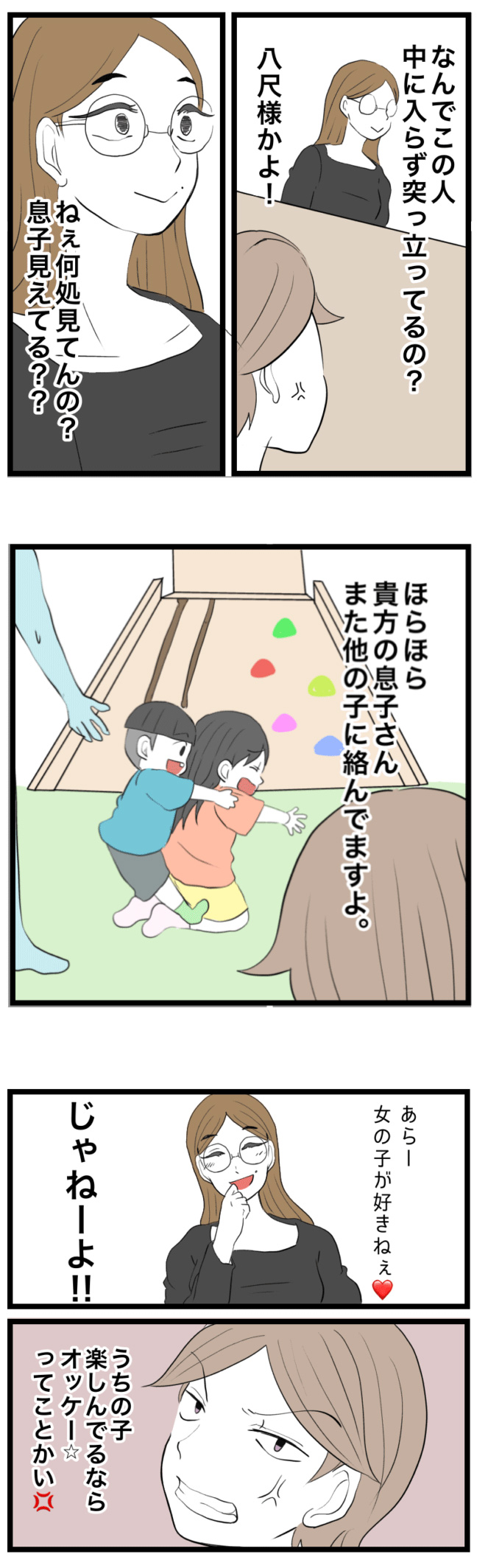 <広告> 「この人、子どものこと見えてんの?」キッズスペースで乱暴する我が子を笑顔で見守る母…次の瞬間【キッズスペースの悲劇~総集編~#2】 by なしえマミ~ ‹ 前の話 一覧 なしえマミ~ ‹12› 2026/04/07 <広告> ‹12› 【キッズスペースの悲劇~総集編~】 ▶ 他の話も読む ★フォローしてなしえマミ~さんの最新記事をチェック! ‹ 前の話 一覧 作者: なしえマミ~ > 作者ページ > SNS なしえマミ~さんの電子書籍 キッズスペースの悲劇 問題児ママの謝罪のお菓子 モンペ保護者に執着された先生 なしえマミ~さんの他のシリーズを読む キッズスペースの悲劇~総集編~ モンペ保護者に執着された先生 問題児ママの謝罪のお菓子 トラブル, ママ, 子育て なしえマミ~, キッズスペースの悲劇~総集編~ <広告> 本記事は個人的体験談などに基づいて作成されており、脚色なども加えられている場合もあり、必ずしも各読者の状況にあてはまるとは限りません。この記事の情報を用いて行動される場合、ご自身の責任と判断により対応いただけますようお願い致します。 尚、記事に不適切な内容が含まれている場合はこちらからご連絡ください。 関連記事 関連記事: 「早く食べないお前が悪い」妻の朝食を食べた夫の“ふざけた言い分”【専業主婦だけど、食い尽くし夫と離婚します #10】 by しろみ 関連記事: 「あなたは何もしなかった!」妻の母に一喝され泣いた夫…翌朝“どや顔発言”、それで済むと思ってる?【限界が来た日、私は家を出た。4話】by ひがしきりん 関連記事: 「学校…もう無理かな」つわりで勉強についていけない…高1の日常が崩れていく【16歳、命と向き合うとき #35】by ふくふく 関連記事: 「怒ってないから帰ってきて」夫の所業に耐えきれず家を出た妻への電話…これ優しさ?【妻が突然家を出て行きました #48】 by ずん 関連記事: 「今日も話せなかった…」夫とすれ違い生活が続くワンオペママ。2歳息子にいつもハラハラさせられて…【父ちゃんを襲った悲劇①】 by ねこざめ 関連記事: いつもは静かな公園に集まった大勢の子供たち!公園の目の前にある家の中では…?【親には言えない 第29話】by こっとん 関連記事: キッズスペースで泣く子が続出!乱暴する子に批判が集まるなか、その子の母親は…?!【キッズスペースの悲劇③】by なしえマミ~ 関連記事: 「これは私のミス!私が何とかしなきゃ!」そんな時にも容赦なく保育園からの呼び出しが…【ママ、辞めます。⑳】by 星田つまみ 関連記事: 妻から『不倫していない証拠』を求められた夫。慌てるなか思いついたことは…?!「育休中に夫が不倫してました262」by ももえ