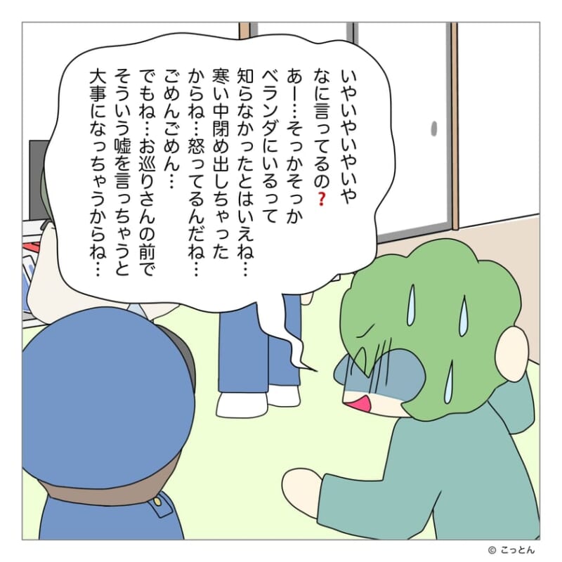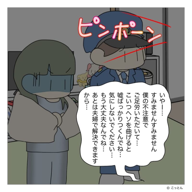 近所からの通報で駆けつけた警察官に対し、夫は何事もなかったかのように言い訳を始めるが…